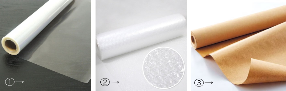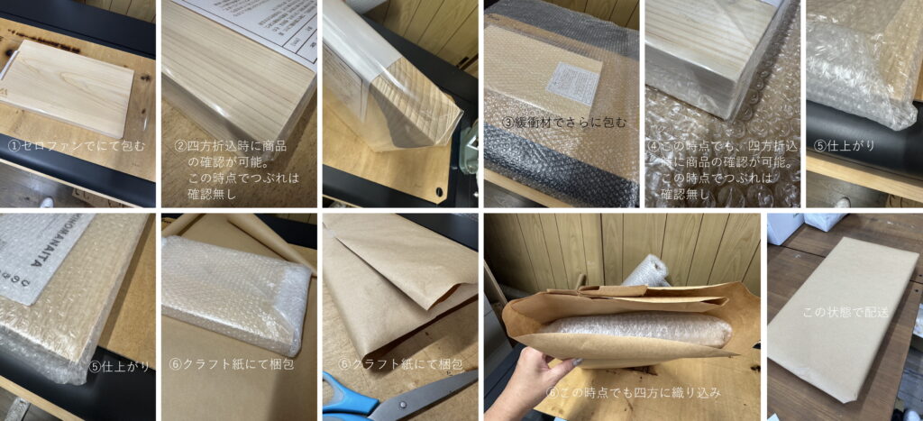 セロハン 緩衝材 クラフト紙の順に梱包します。