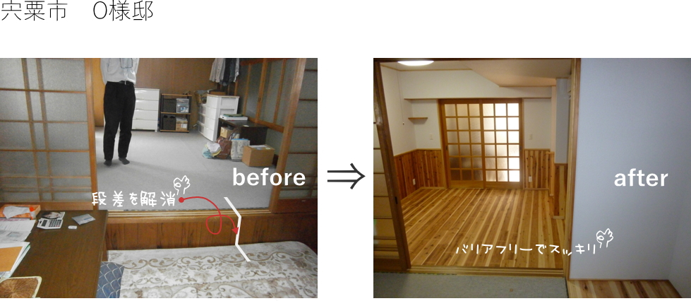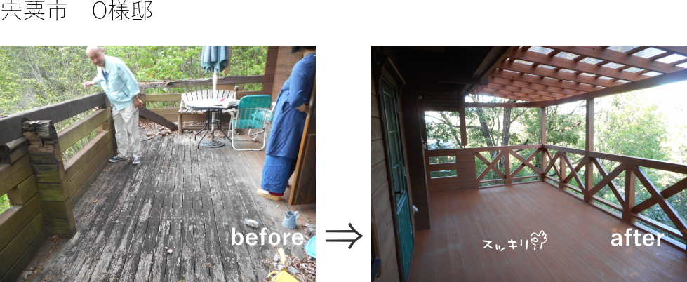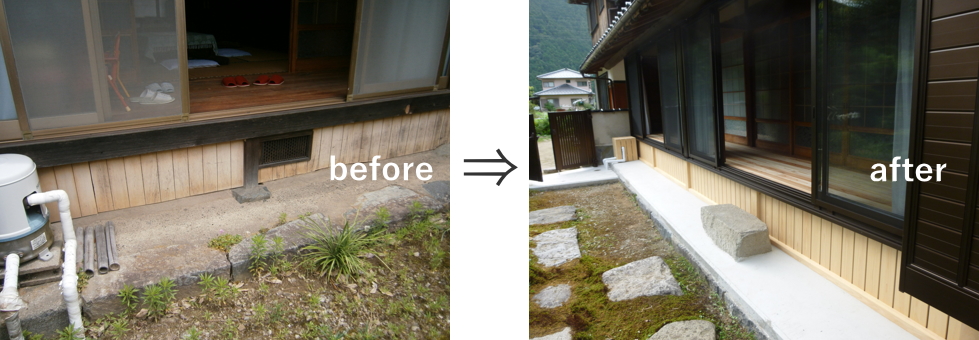 段差をなくし、安全且つ木の香りに包まれた空間にしました。外構も無垢のやり替えで、イメージはぐんとよくなります。