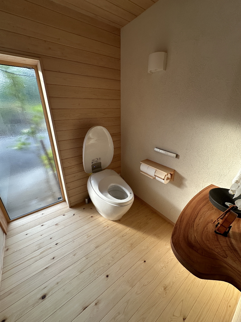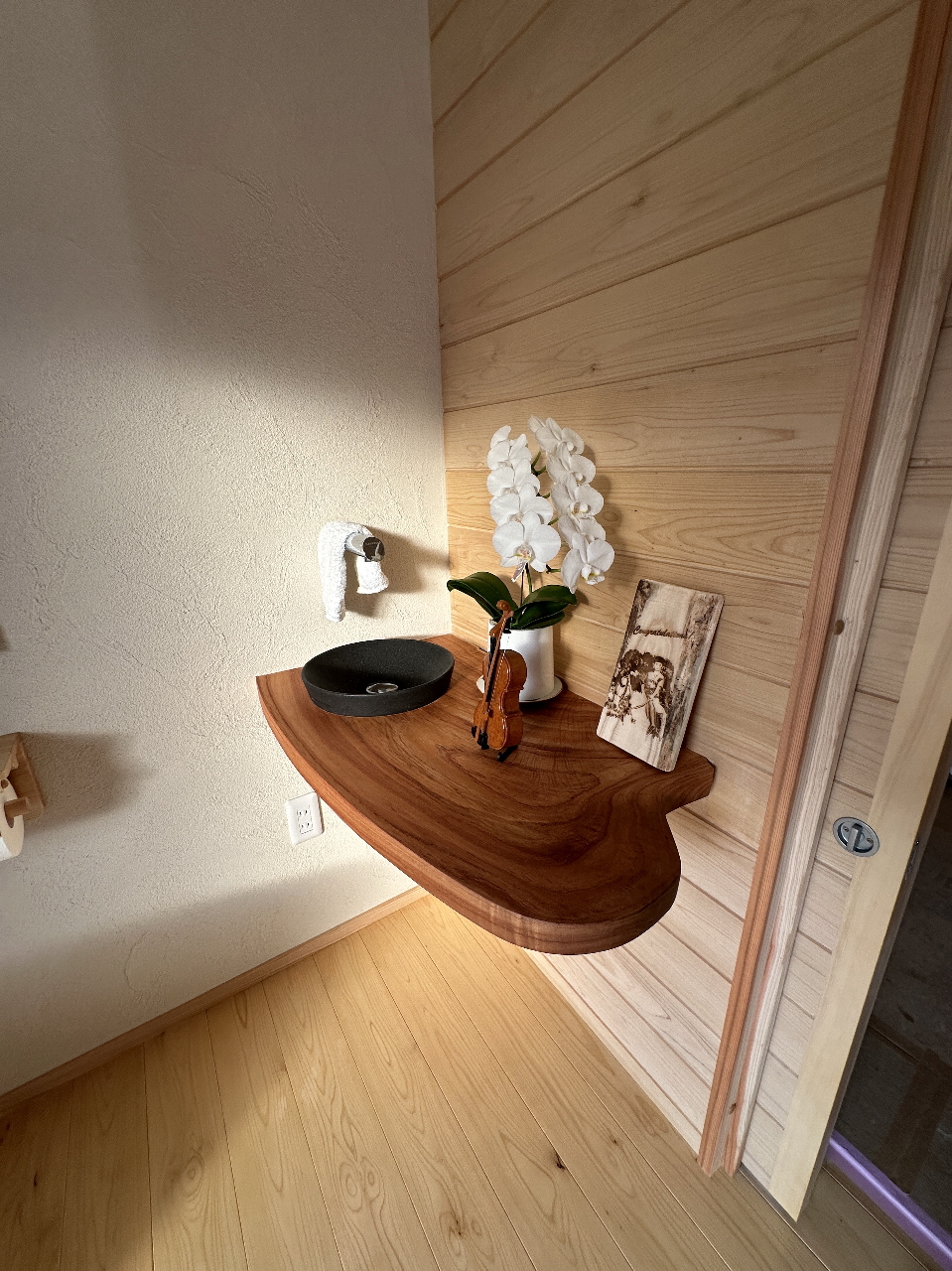 工事を担当したのは、宮下木材と長い付き合いのある熟練の大工さん。能登ヒバの特性を熟知し、木の風合いを最大限に活かした仕上がりに。道具を巧みに操る姿は、まるで職人の技を感じる事のできる現場となりました。